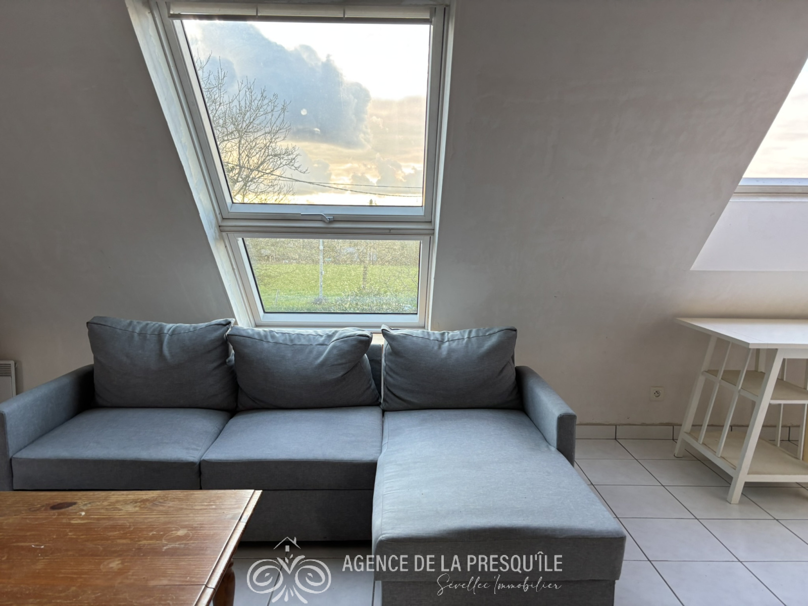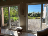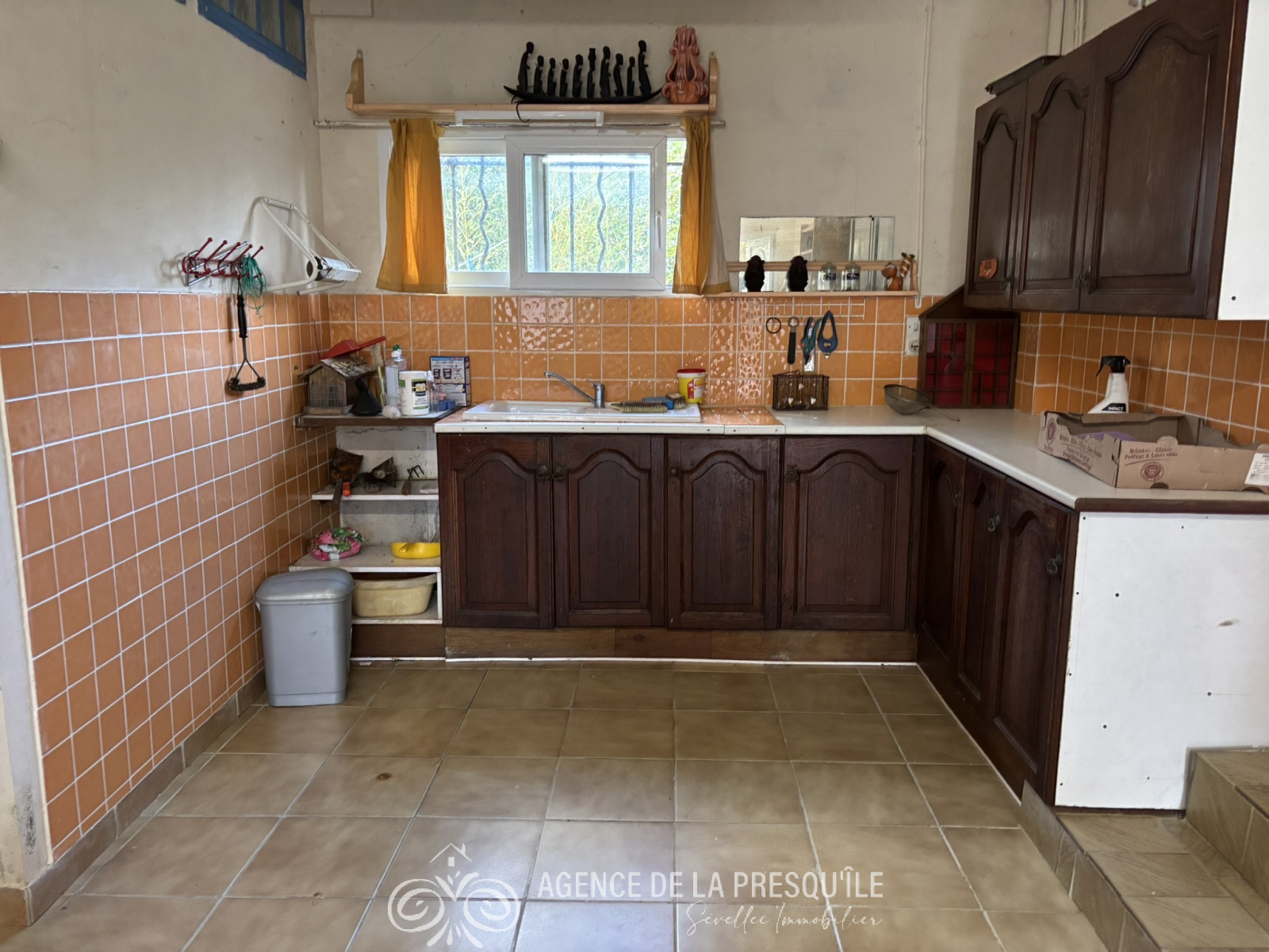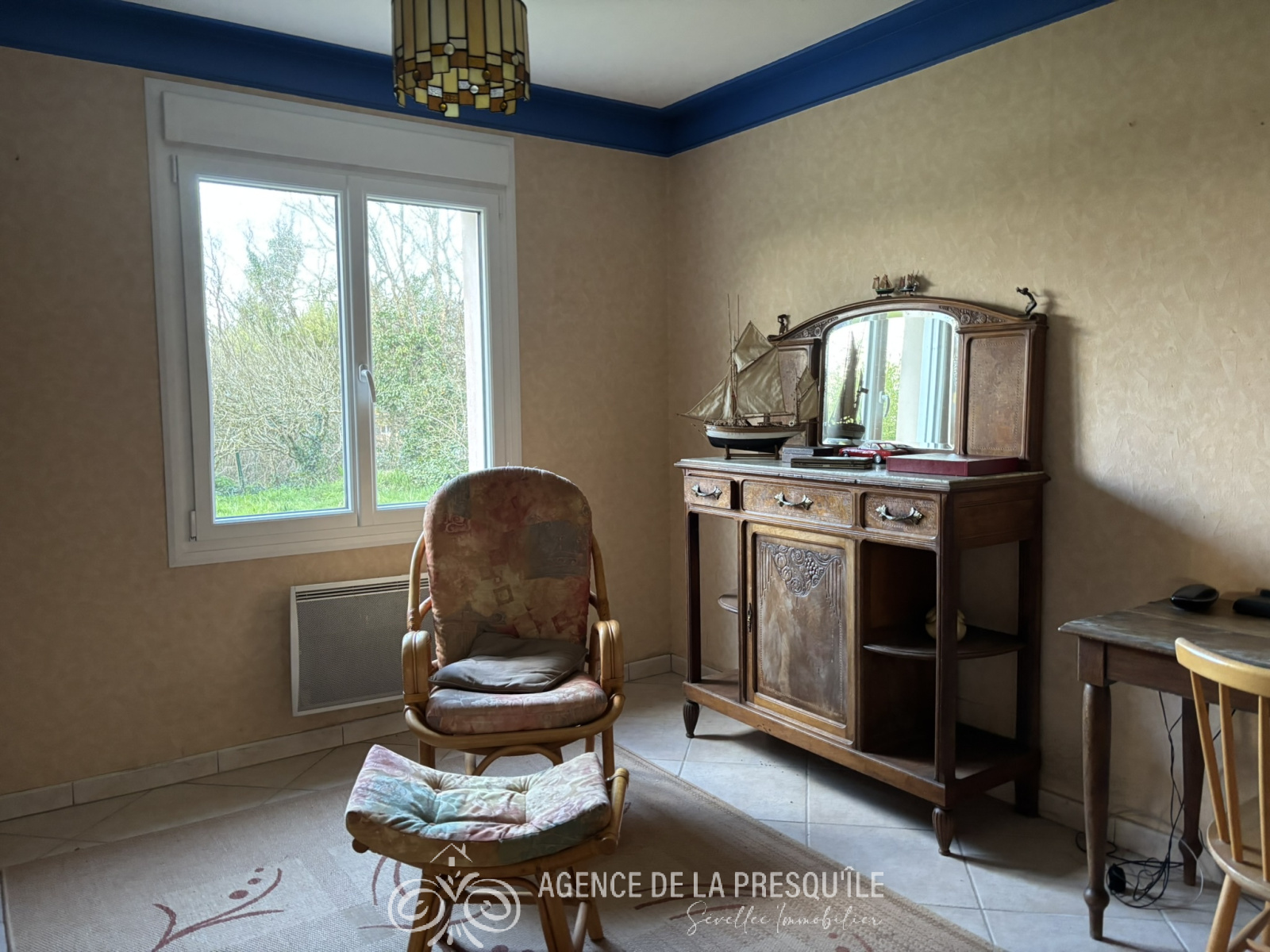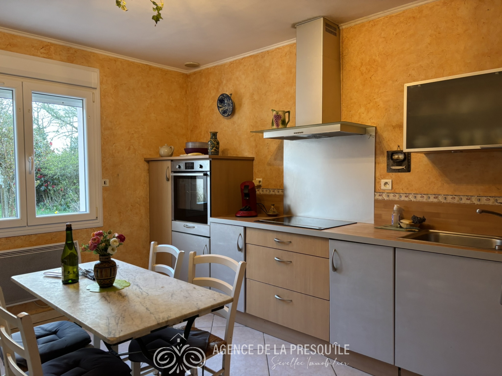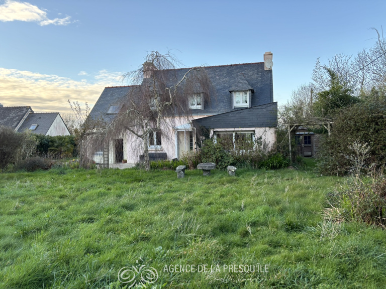 Cette spacieuse maison néo-bretonne, exposée sud et située dans un environnement verdoyant à moins de 1.5 km des commerces offre de nombreuses potentialités avec sa grande dépendance comprenant un appartement T3 indépendant. La maison principale comprend au rez-de-chaussée: entrée, grande salle à manger avec coin bureau, salon avec cheminée donnant sur terrasse, cuisine ouverte, WC, buanderie; et à l'étage: trois chambres, salle de bains, WC séparé. Garage attenant. Grand garage indépendant d'environ 58 m² avec appartement composé d'une pièce de vie avec coin cuisine, deux chambres, salle d'eau et WC à l'étage. Jardin agréable joliment aménagé.