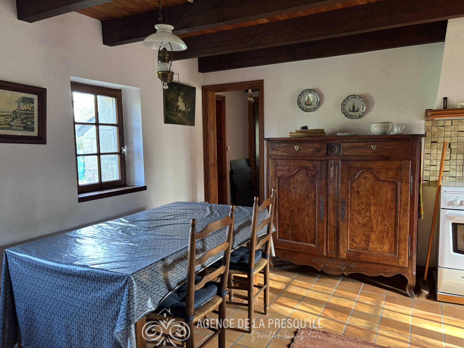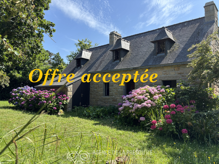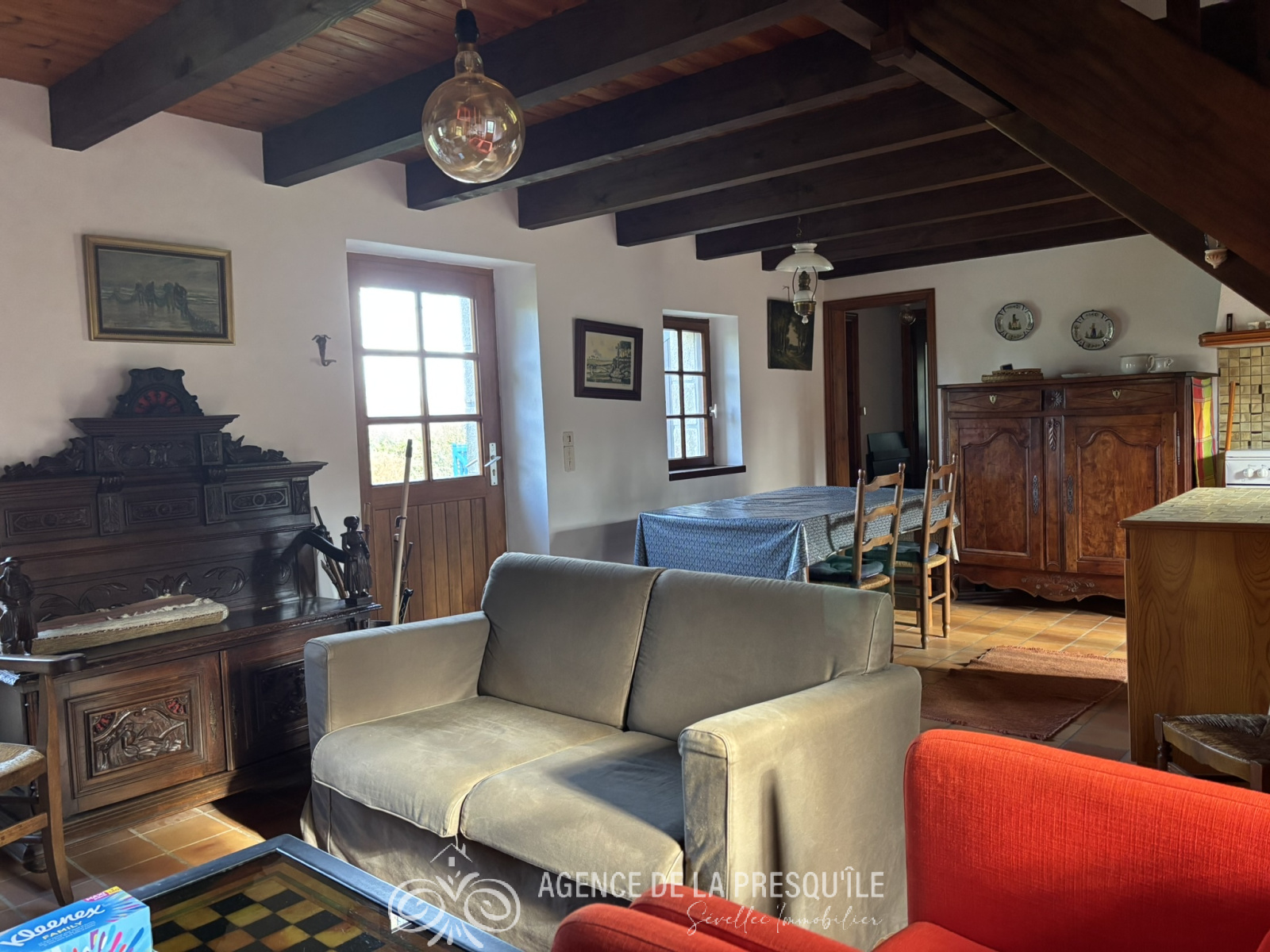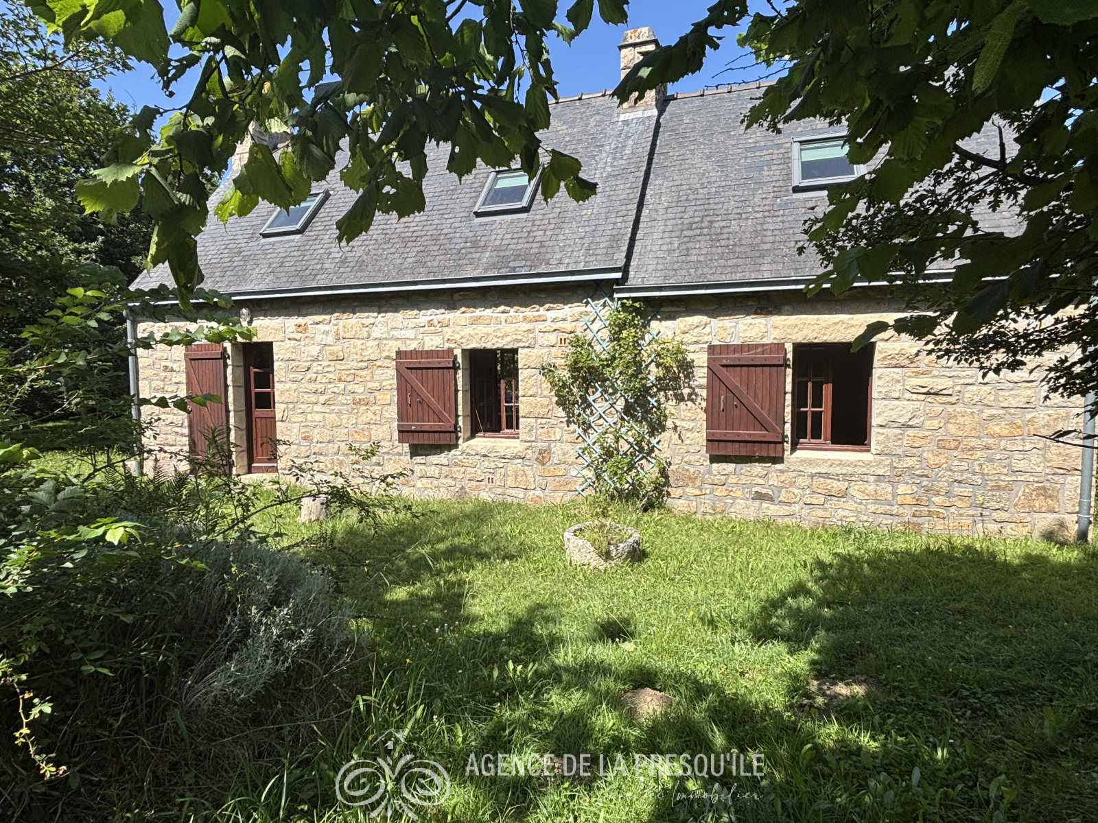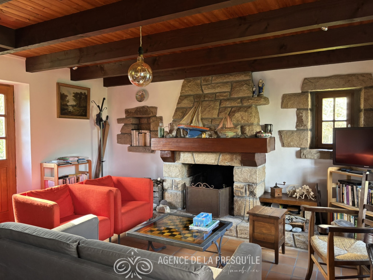SOUS COMPROMIS - située au calme, à proximité de la mer et des sentiers, cette maison de caractère profite d'un beau parc arboré. Elle comprend au rez-de-chaussée : pièce de vie avec cheminée, cuisine ouverte, chambre, salle d'eau, WC, cellier avec coin buanderie ; et à l'étage : dégagement, deux chambres mansardées, une pièce et cabinet de toilettes. Grand jardin de plus de 5000 m² avec abris. Etat des risques disponible à l'agence.
