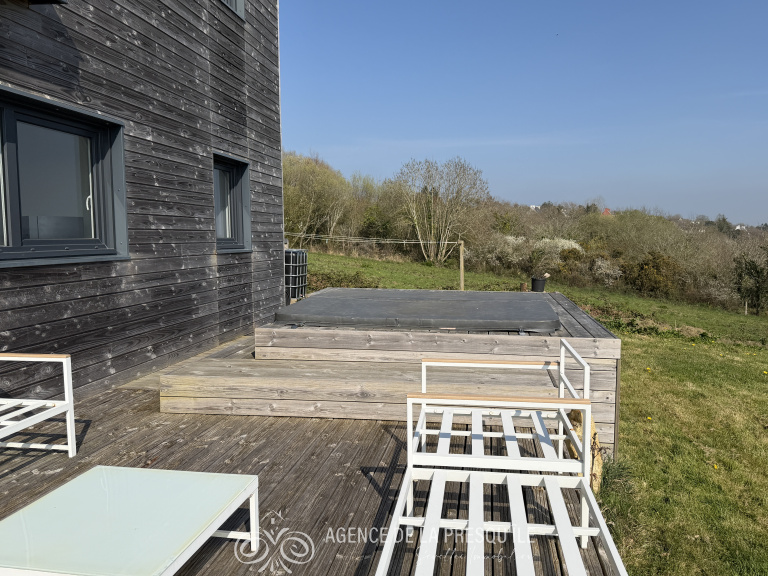 Située à 500 mètres des services et à moins de 3 km de la plage de l'Aber, cette belle maison contemporaine, lumineuse et confortable, profite d'une exposition sud et d'une agréable perpective sur une nature préservée. Elle comprend au rez-de-chaussée : entrée, pièce de vie à l'ambiance chaleureuse donnant sur une grande terrrasse, cuisine aménagée, cellier attenant, chambre, salle d'eau et WC. A l'étage, vous trouverez trois chambres et une salle d'eau avec WC. A l'extérieur profitez de la terrasse et de son SPA 8 places permettant de profiter de moment de détente et d'un garage indépendant de 28 m² disposant d'une belle surface de stockage. Le tout sur un terrain de 1700 m² environ. Etat des risques disponible à l'agence.
