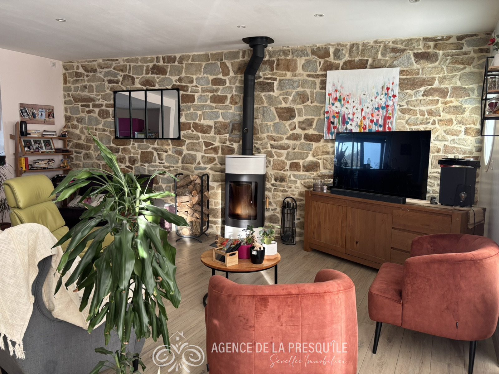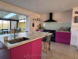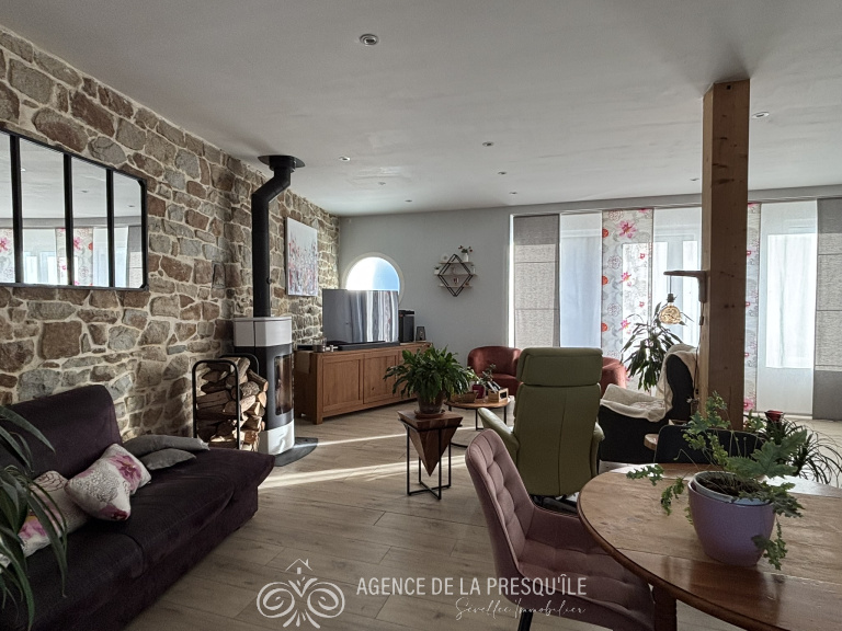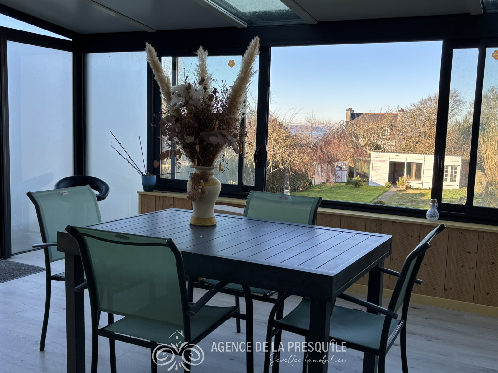 Cette maison renovée avec gôut est située à proximité immédiate des commerces et à moins d'un kilomètre de la mer. Elle propose une spacieuse vie de plain pied avec au rez-de-chaussée : une entrée, une vaste pièce de vie avec poêle, cuisine aménagée ouverte donnant sur véranda, suite parentale composée d'une chambre avec salle d'eau ouverte et dressing, cellier, WC séparé. A l'étage: trois chambres dont une avec douche et lavabo, salle d'eau. Vue mer de l'étage. Cave. Jardin avec abri. Etat des risques disponible à l'agence.