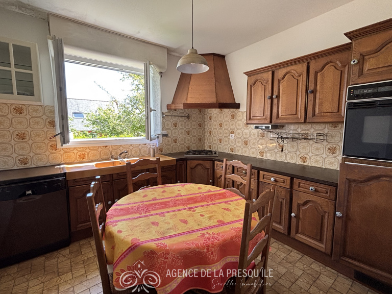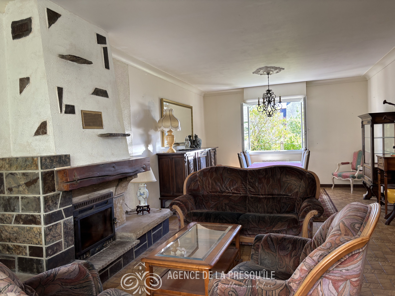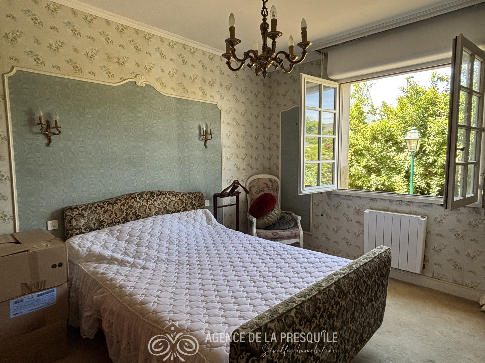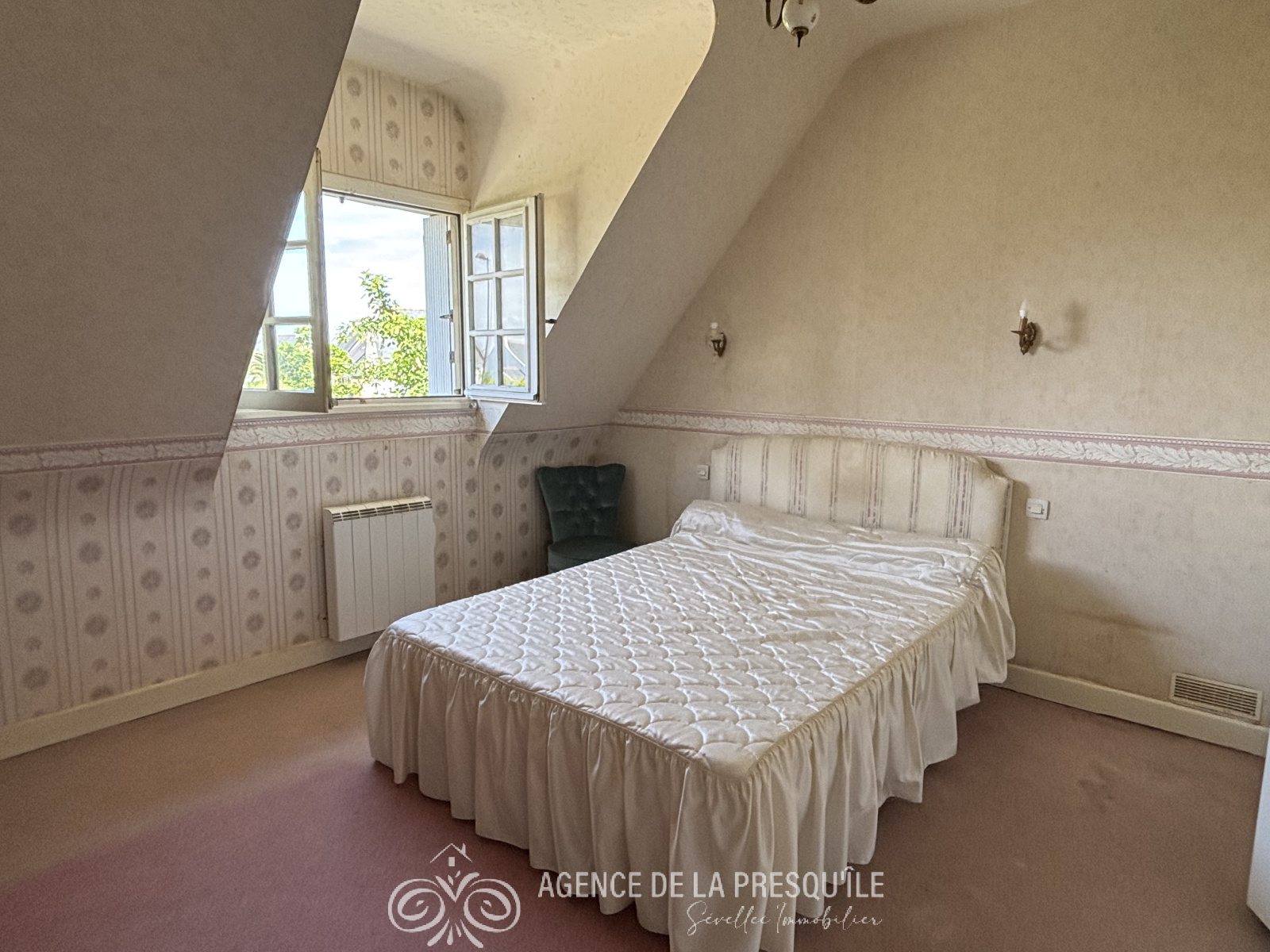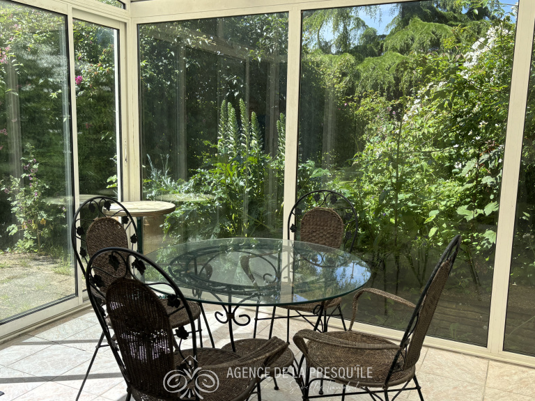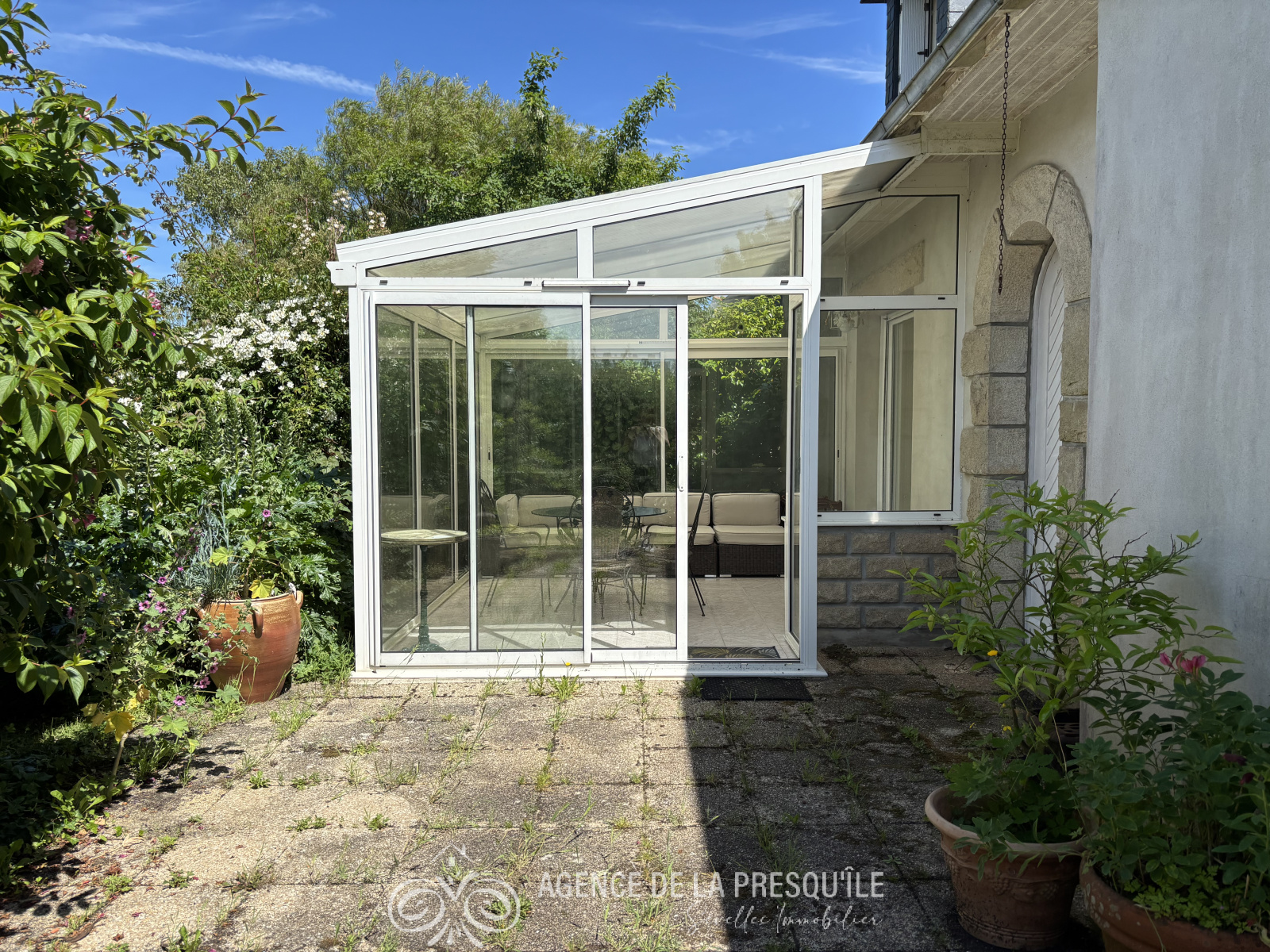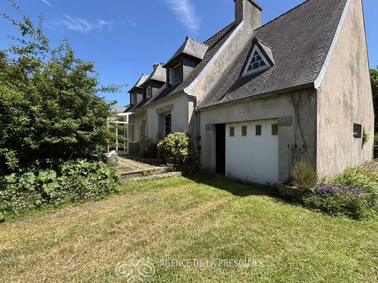 Cette belle maison néo-bretonne située à proximité des services profite d'un agréable espace de vie de plain-pied et d'un beau jardin arboré. Elle comprend au rez-de-chaussée : entrée, séjour avec cheminée donnant sur véranda, cuisine aménagée, chambre, salle de bains et WC. L'étage propose 3 chambres, un bureau, une salle d'eau et WC. Garage attenant avec grenier au-dessus.