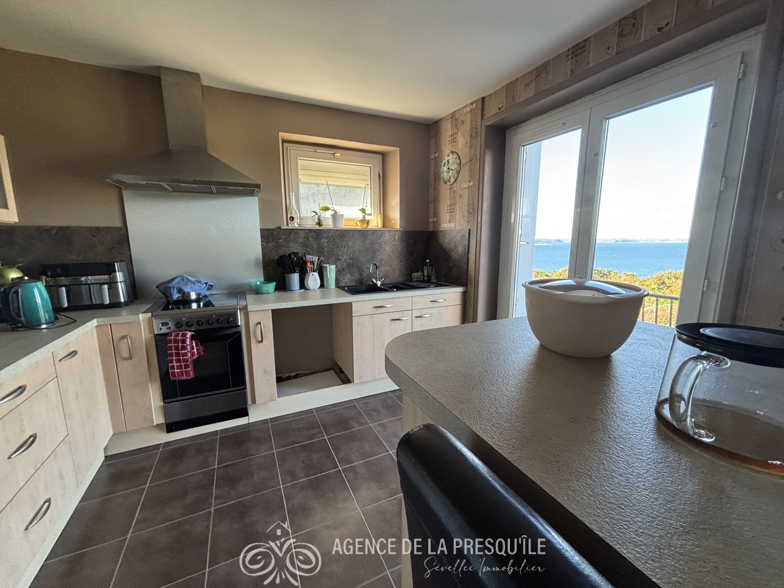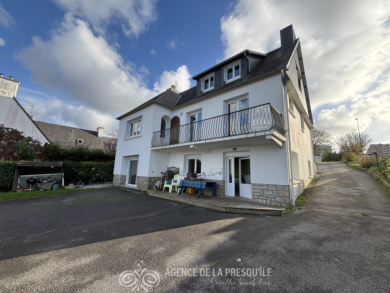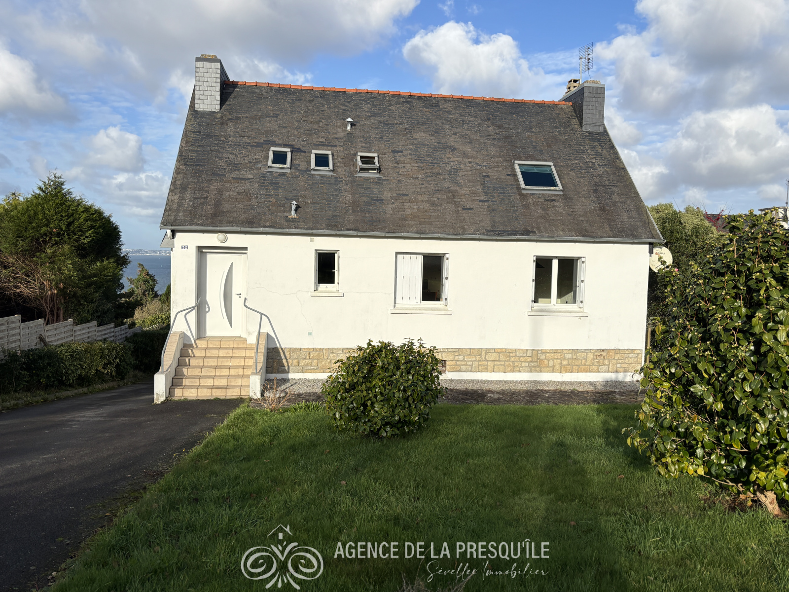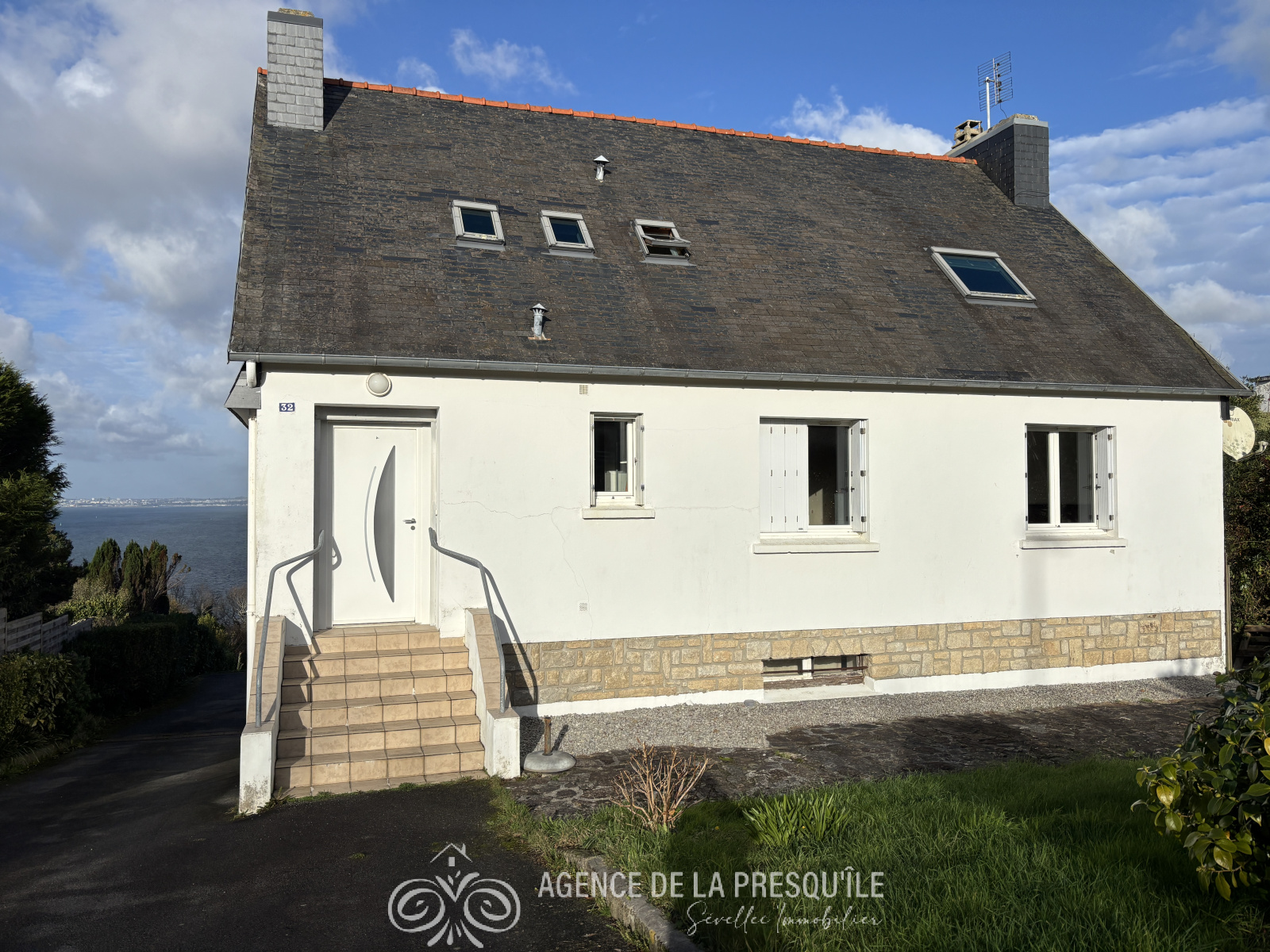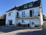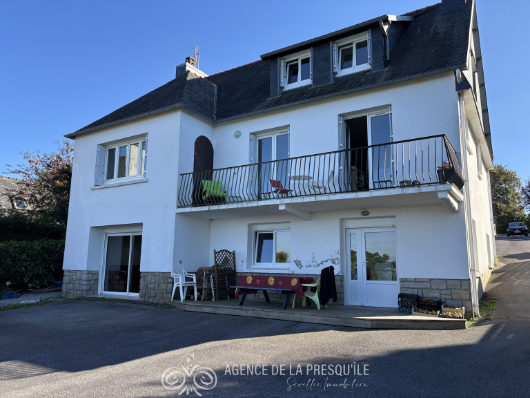 Découvrez cette belle propriété néobretonne profitant d'une belle vue panoramique sur mer et située à proximité immédiate des services. Elle comprend au-rez-de jardin : appartement indépendant avec pièce de vie et coin cuisine, chambre avec salle d'eau, pièce de stockage, buanderie. L'habitation principale accessible du rez-de-chaussée se compose: d'une entrée, d'un salon-séjour, d'une cuisine, d'une chambre, d'un bureau, d'une salle d'eau et d'un WC séparé. A l'étage : trois chambres et un cabinet de toilettes. Jardin. Le tout sur un terrain de 2169 m². Etat des risques disponible à l'agence.