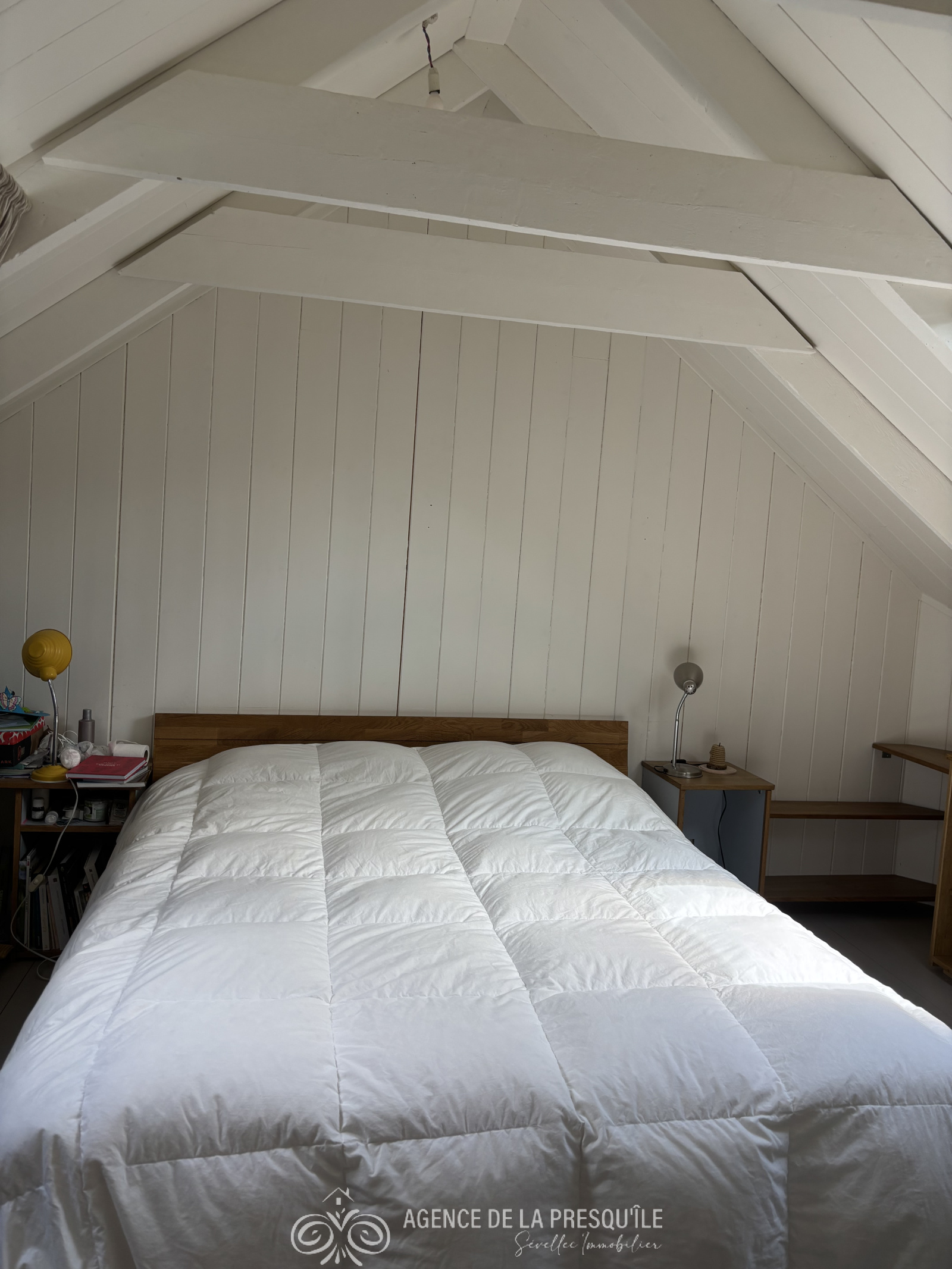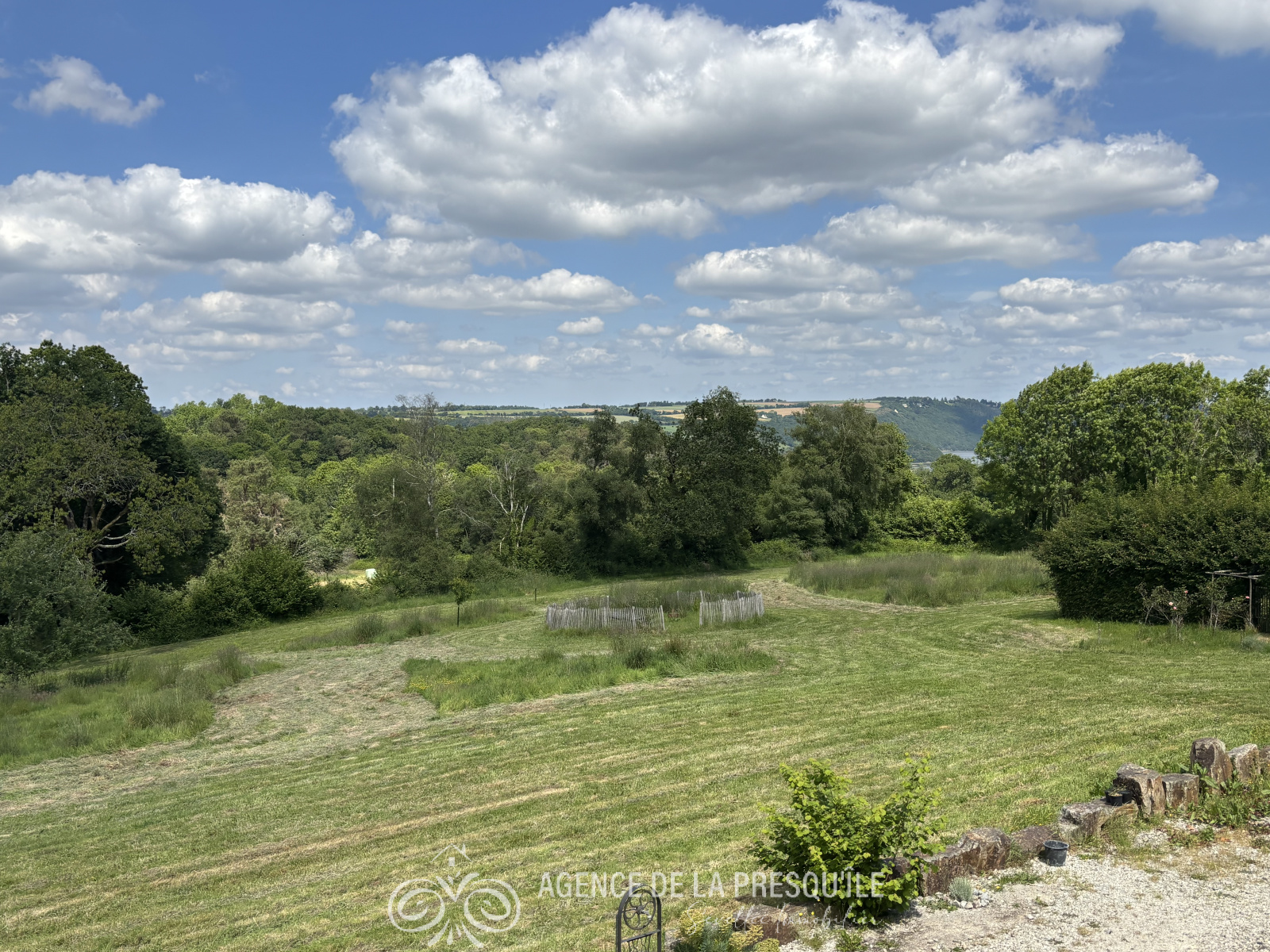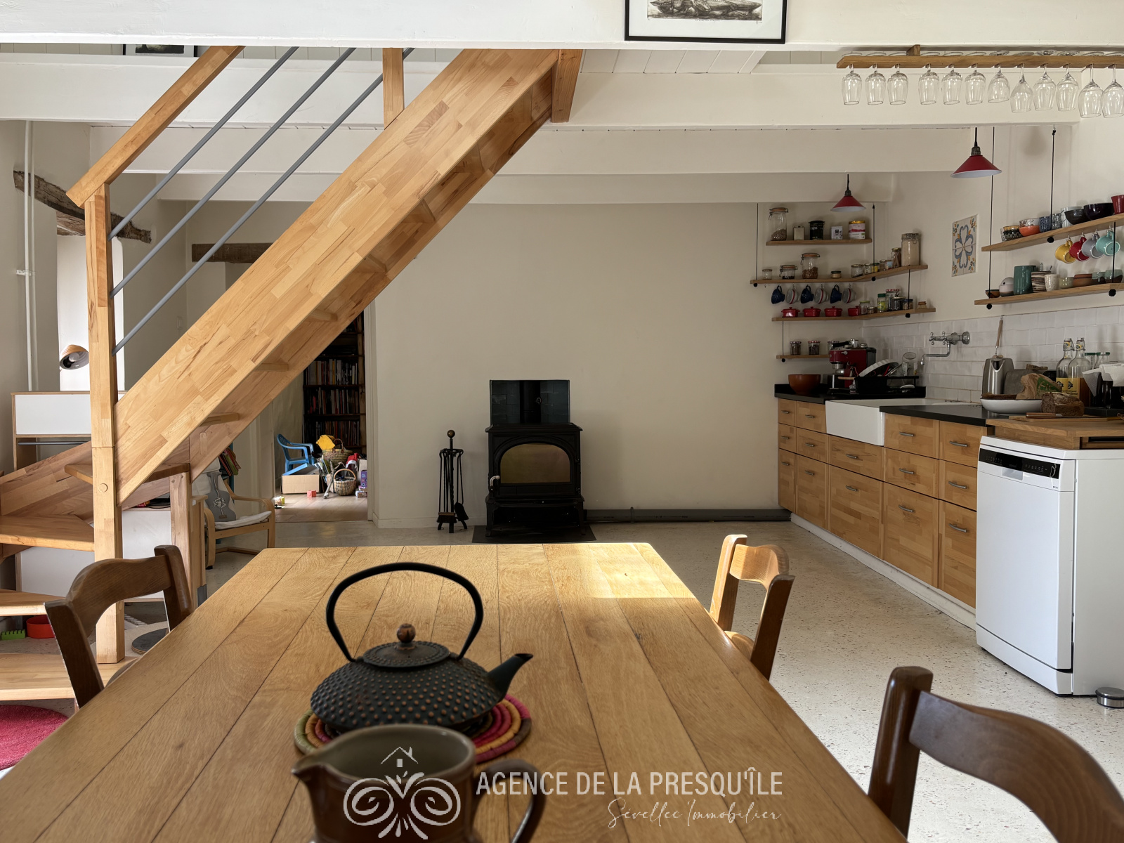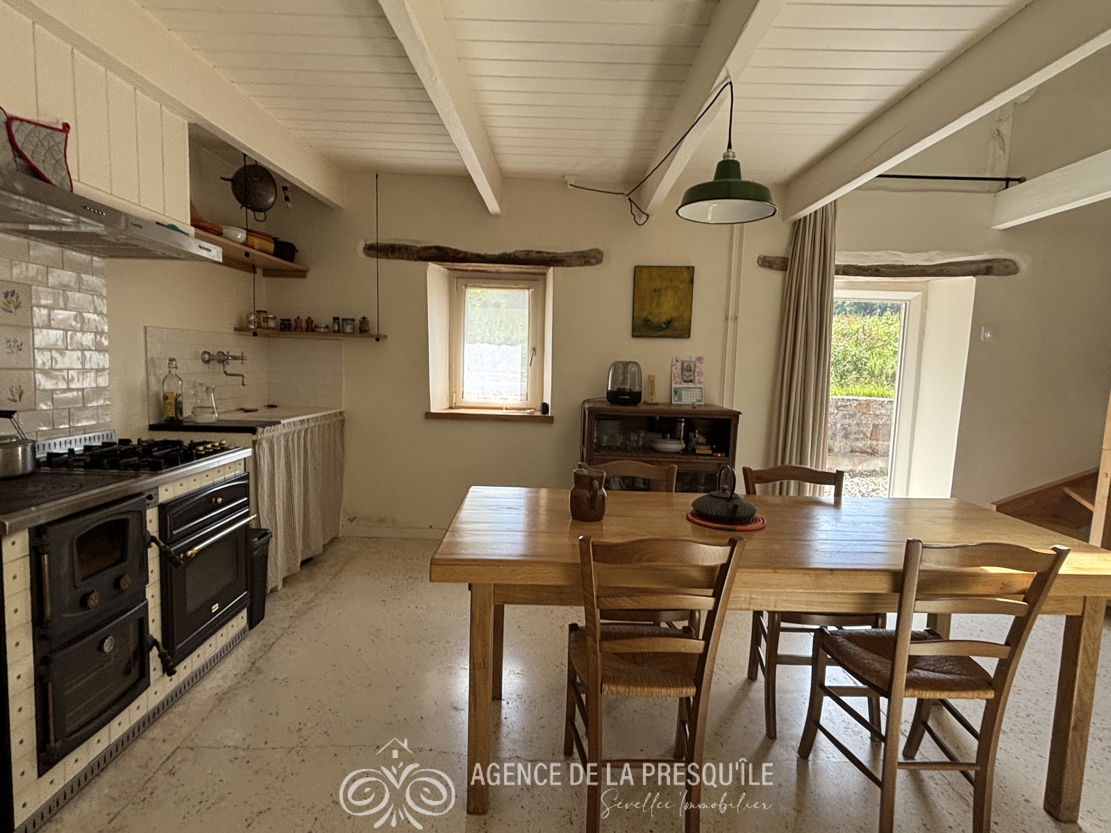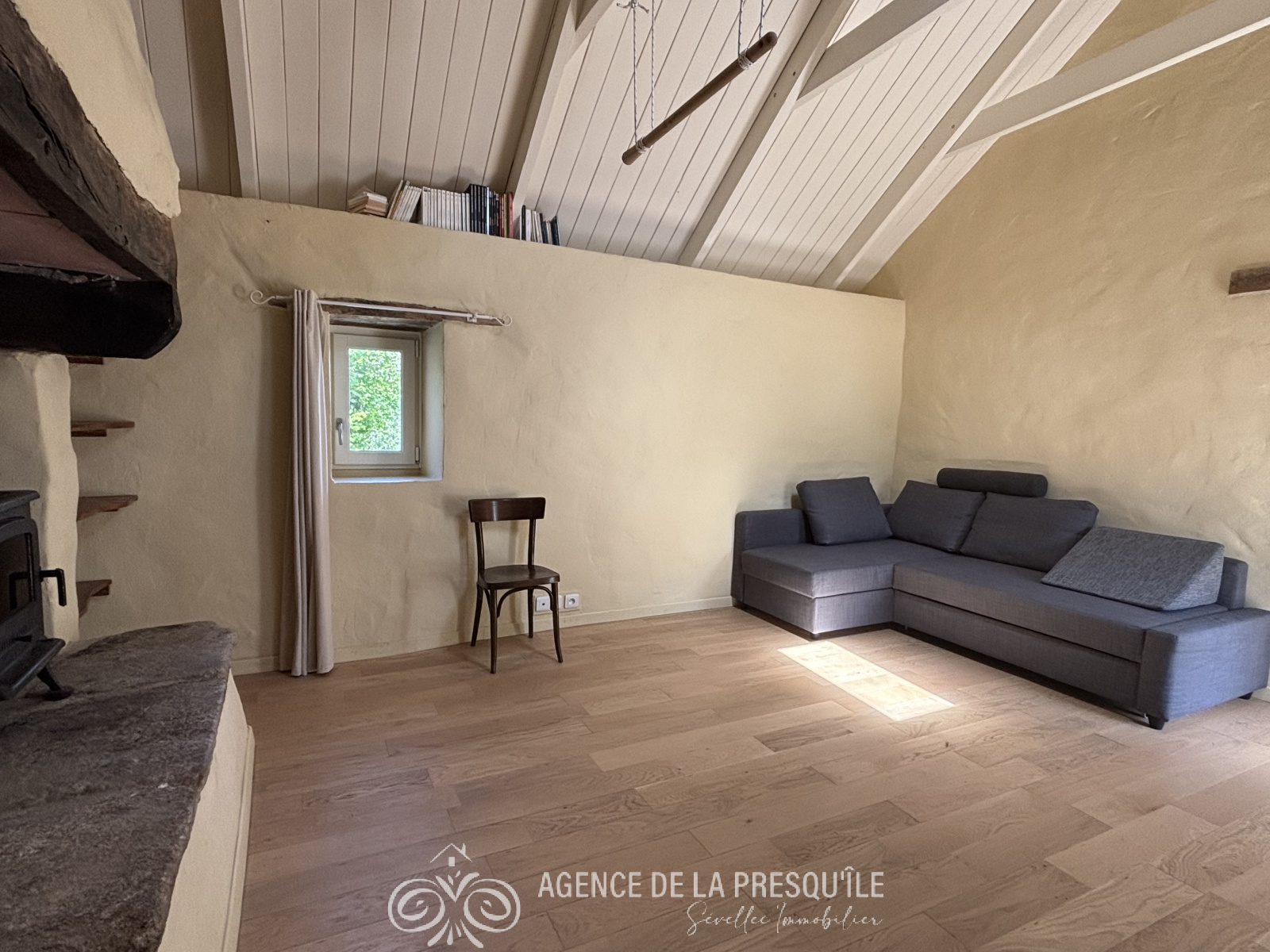 Située à l'entrée de la Presqu'île, dans un cadre verdoyant et sans vis-à-vis, cette propriété rénovée avec goût, profite de beaux volumes et d'un terrain attenant avec hangar de plus d'un hectare ainsi que des parcelles boisées et agricoles situées à proximité immédiate de plus de 6 hectares. La maison d'habitation comprend au rez-de-chaussée : hall d'entrée, salon avec poêle à bois, bureau attenant, grande cuisine aménagée et équipée donnant sur véranda, salle d'eau et WC. L'étage est composé de deux chambres situées au-dessus de la partie principale de la maison et d'une troisième chambre indépendante située à l'est de la maison. Grand hangar avec chaudière bois et préau. Jardin potager avec serre en verre. Le tout sur 71 896 m2.